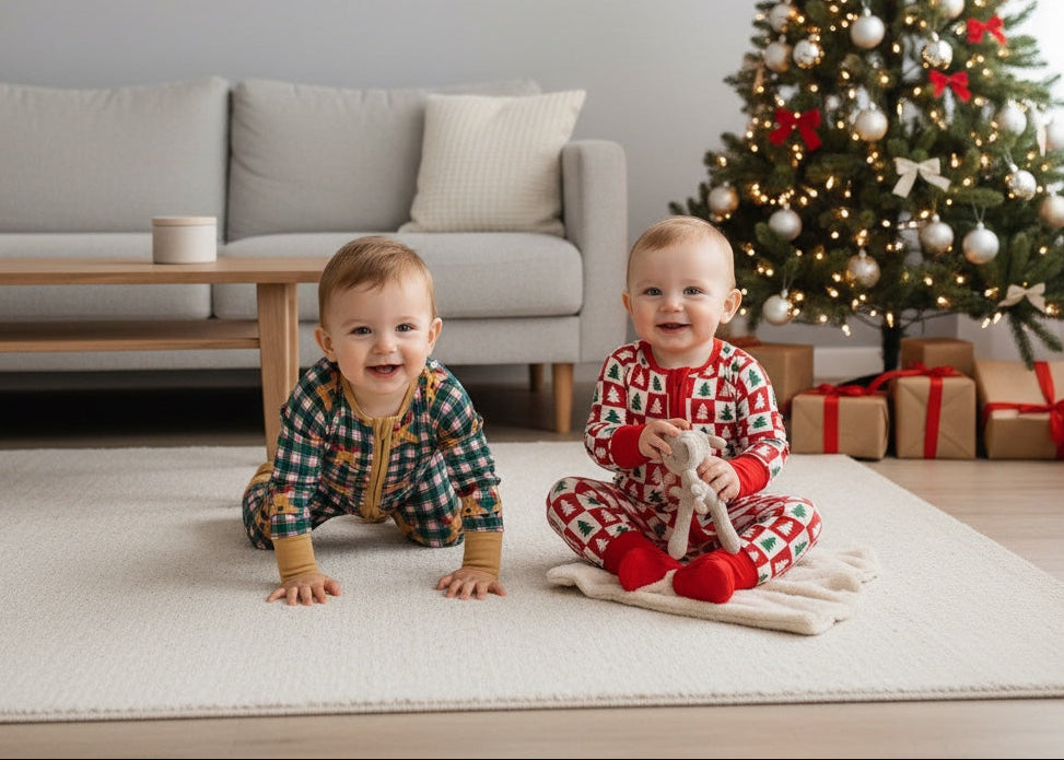 Our pajamas are made from a premium bamboo blend that’s incredibly soft, breathable, and gentle on sensitive or eczema-prone skin. Bamboo helps regulate temperature, so baby stays cozy without overheating—especially when they’re bundled up for holiday photos or sleepy snuggles by the tree.